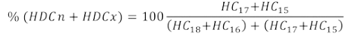 De forma análoga, el porcentaje que representan las dos reacciones que se caracterizan por disminuir en un átomo de carbono el largo de las cadenas de los ácidos grasos de partida (HDCn + HDCx) se puede estimar a partir del contenido de hidrocarburos C15 y/o C17: