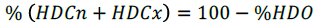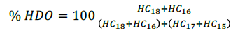 donde % HDO es el porcentaje de participación de la HDO en el proceso «total» de conversión del sustrato a parafinas y HCi es el porcentaje del hidrocarburo de largo de cadena «i» en el producto.