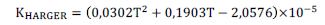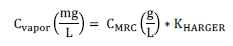 A partir de la ecuación experimental propuesta por Harger (OIML, 2012), la relación entre la concentración de etanol en la solución acuosa (MRC) y el vapor generado por el simulador de soplo se rige por la Ecuación 1, mediante una constante de partición KHARGER dependiente de la temperatura. A 34 °C, la temperatura estimada del aliento humano (Harger, et al., 1950b), la KHARGER toma el valor indicado en la Ecuación 3.