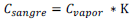 La concentración de etanol en vapor (simulando el aire exhalado) se vincula con la concentración de etanol en sangre mediante la ley de Henry, donde K es el coeficiente de partición e indica cómo el alcohol se distribuye entre la fase líquida (sangre) y la fase gaseosa (aire alveolar). Este valor es tomado como referencia en la calibración.