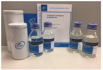 Materiales de Referencia Certificados de fracción de masa de etanol en agua producidos en el LATU según Guía ISO 34:2009 (International Organization for Standarization, 2009).