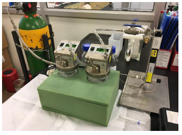 Para la optimización y validación de la calibración de espirómetros por vía húmeda se utilizaron dos simuladores de soplo 10-4D (Guth Laboratories, Inc) conectados en serie, como se muestra en la Figura 2. Para los estudios de límites de detección y cuantificación se utilizó un sistema simple, donde solo se utiliza un simulador. Los sensores de temperatura son calibrados anualmente para verificar que su error no supere 0,1 °C, dada la alta dependencia de la partición del etanol entre la solución y la fase gaseosa con la temperatura. El suministro de aire para la simulación del aliento provino de cilindros de aire sintético comercial, y se controló por un flujímetro de división 0,1 L/min. Para las pruebas de optimización del método de calibración de espirómetros se utilizó un equipo con detección de celda de combustible (Alco-Sensor FST, Intoximeters, Inc.).