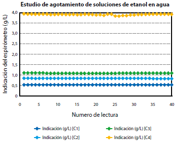 Uno de los puntos más críticos de la calibración con simulador de soplo es el agotamiento de la solución, el fenómeno por el cual la concentración de etanol en el vapor que emana desde el simulador de soplo disminuye a medida que transcurren las mediciones. Para estudiar la influencia de este fenómeno se realizaron 40 mediciones en un sistema de dos simuladores de soplo en serie, utilizando soluciones de etanol en agua preparadas gravimétricamente a cuatro fracciones de masa equivalentes a 0,4, 0,7, 0,9 y 3,9 gramos de etanol por litro de sangre: [C1], [C2], [C3] y [C4], respectivamente. A partir de estos datos se realizó un estudio de significancia de pendiente basado en el análisis estadístico para estudio de estabilidad según la Guía ISO 35:2006 (International Organization for Standarization, 2006), en la sección 8.3.1.