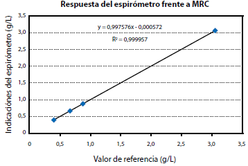 Relación entre la respuesta del espirómetro y el valor de referencia a partir de MRCs de producción interna (LATU).