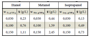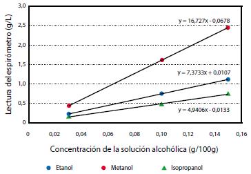 Respuesta del espirómetro frente a soluciones acuosas de etanol, metanol e isopropanol de diferentes concentraciones. x promedio de las indicaciones del espirómetro.