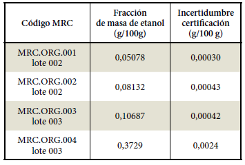 Ejemplos de lote de Materiales de Referencia Certificados de fracción de masa de etanol en agua producidos en el LATU según Guía ISO 34:2009 (International Organization for Standarization, 2009).