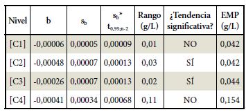 Se considera que la pendiente (tendencia) no es significativa si |b|< t0,95;n-2 * sb, donde t es el estadístico t de Student, con probabilidad de 0,95 y n - 2 grados de libertad.