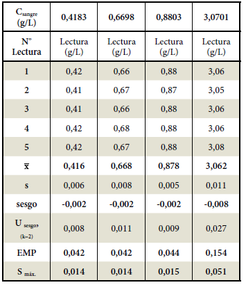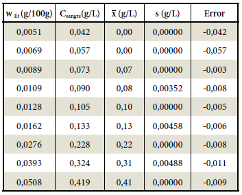 Para evaluar la exactitud del método, se utilizaron soluciones de etanol en agua preparadas gravimétricamente (MRCs de producción interna) y se determinó el error para cada nivel. Además, se analizaron dos Materiales de Referencia Certificados del Instituto Metrológico Nacional de Brasil (INMETRO). La diferencia obtenida entre el promedio de las indicaciones del espirómetro (n=5) y el valor de referencia, calculado según la Ecuación 4, fue utilizado como estimador de sesgo del método (Ecuación 9) y la desviación estándar relativa de las indicaciones, como estimador de repetibilidad (Ecuación 10).