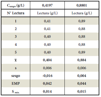 Los resultados permiten evidenciar que la mínima concentración de prueba a la cual el espirómetro responde fue 0,073 g/L (en sangre), mientras que en la concentración de prueba por debajo de este valor la respuesta fue nula. Adicionalmente, por encima de este nivel la desviación estándar y el error cumplieron los requisitos de exactitud necesarios (EMP/2 y Smáx./2), lo cual evidenció un buen desempeño de cuantificación. Este resultado implica que durante medidas en tránsito este espirómetro no indicaría una lectura mayor a cero en el rango en el cual se pondría en duda si la lectura «es o no» cero gramos de alcohol por litro de sangre.