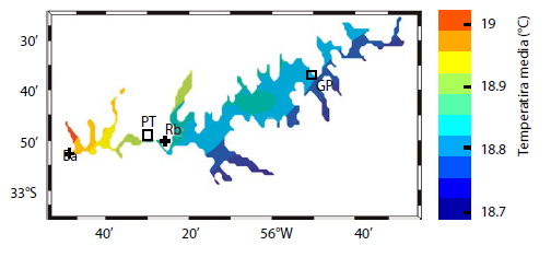 La variabilidad espacial fue menor que la temporal, lo cual es esperable para la extensión de los embalses analizados y su ubicación en latitudes medias. En el eje espacial se encontró un gradiente de aumento de temperatura desde aguas arriba hacia aguas abajo del área estudiada. Este patrón podría relacionarse con los tiempos de residencia del agua, ya que el límite de la región aguas abajo se encuentra después del embalse del Rincón del Bonete, cuyo tiempo de residencia es el mayor de los tres con un promedio de 150 días (Chalar, et al., 2014). Al incrementar el tiempo de residencia del agua, aumenta también la exposición a la radiación solar y, en consecuencia, al calentamiento durante los meses de primavera-verano (Allan y Castillo, 2007).