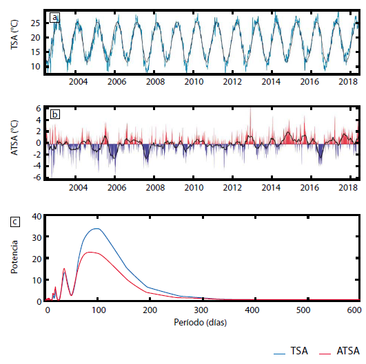 La Figura 2a muestra la serie temporal de TSA utilizada en esta sección, calculada como el promedio espacial de los datos utilizados. Se observa el predominio de la estacionalidad en la variabilidad de la serie temporal (Figura 2a, línea negra). El mínimo de TSA observado fue de 7,80 °C y sucedió el 2 de agosto de 2007, mientras que el máximo fue de 29,34 °C el 27 de febrero de 2017. De las anomalías se observa una dominancia de la variabilidad en escala de días, semanas y a nivel estacional, variando entre valores negativos y positivos. Los extremos de anomalías presentan valores cercanos a -6,00 °C y 6,00 °C. Estos valores tienen persistencia menor a una semana. Los extremos negativos sucedieron mayormente en setiembre de 2002 y diciembre de 2005 y los positivos en noviembre de 2012. También se observa una tendencia de mayor cantidad de valores positivos hacia el presente. Se destaca la predominancia de la variabilidad estacional que se mantiene aun en las anomalías (Figuras 2b y 2c). En cuanto a la cuantificación de las escalas de variabilidad a través del análisis espectral de la serie y las anomalías, se observan tres picos con una periodicidad de 90, 40 y 20 días, de mayor a menor intensidad, asociados con la variabilidad estacional e intraestacional (Figura 2c).