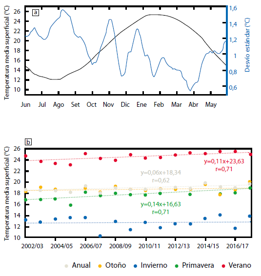 La serie temporal promediada espacialmente del Río Negro presenta un ciclo estacional con un promedio anual de 18,83 °C, mientras que el promedio mensual exhibe una mínima de 12,08 °C y una máxima de 25,23 °C en julio y enero, respectivamente. El desvío estándar también presenta estacionalidad, con mayor variabilidad durante los meses de invierno, cuando se observa un pico máximo de 1,60 °C en agosto y un mínimo a fines de marzo de 0,60 °C. También se constatan 3 picos por encima de 1,00 °C a mediados de junio, principio de noviembre y fines de diciembre en momentos de transición (Figura 3a). En cuanto al análisis de tendencia de la media anual, presenta una correlación de 0,62 (p.valor <0,05) y una tasa de incremento anual (pendiente) de 0,06 °C por año. Esta tendencia está explicada por las estaciones de primavera y verano, ya que ni invierno ni otoño presentan una tendencia significativa. A su vez, tanto primavera como verano presentan un valor de correlación de 0,71. Sin embargo, la pendiente para primavera es mayor, 0,14 °C por año mientras que la de verano es 0,11 °C por año (Figura 3b).