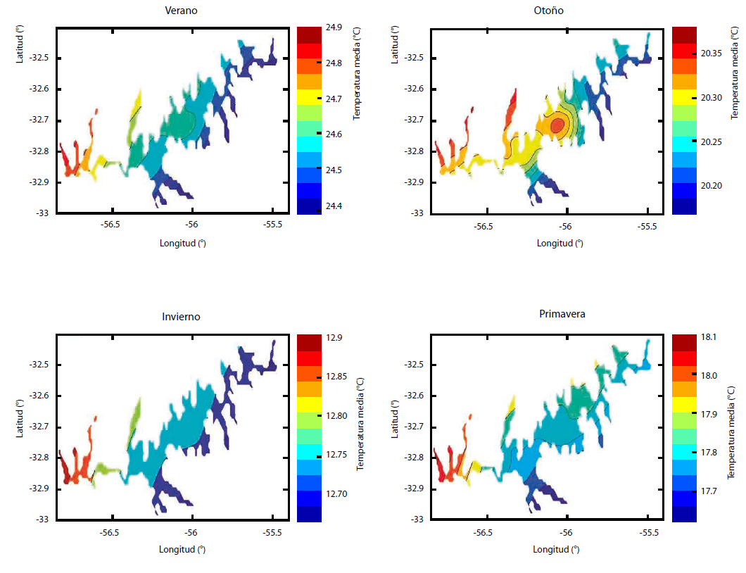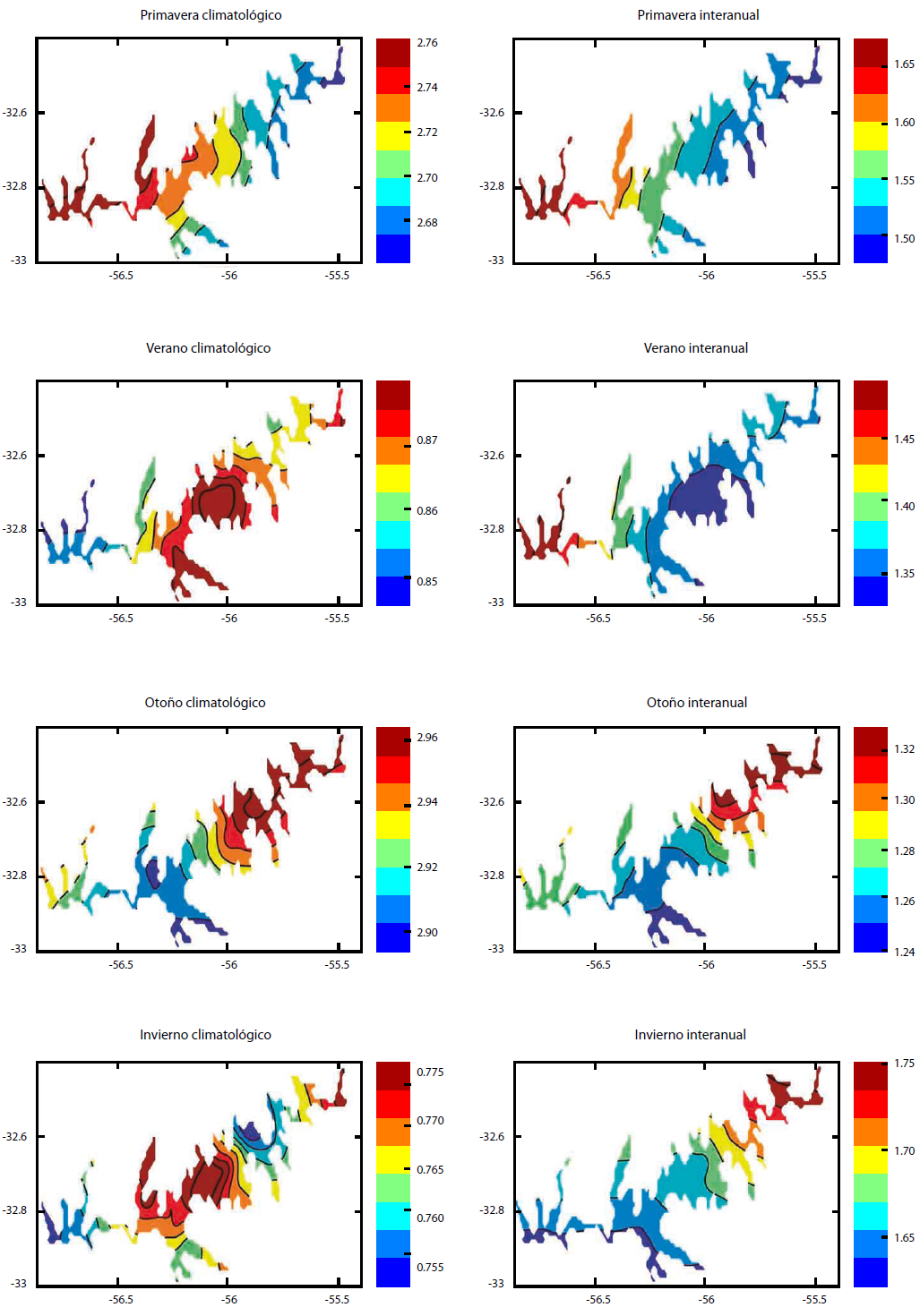 En cuanto a la variabilidad de la temperatura por estación, se observan patrones distintos en el desvío estándar dentro de cada estación (climatológico) y año a año para cada estación (interanual). En el desvío climatológico se observan los máximos para las estaciones de transición otoño y primavera con valores de 2,96 °C y 2,76 °C, respectivamente, mientras que invierno y verano presentan valores máximos de 0,78 °C y 0,88 °C, respectivamente. Otoño y primavera son las estaciones que presentaron mayor variabilidad. A su vez, se observa un patrón en el que primavera-verano tienen mayor variabilidad en la región oeste de la zona de estudio (aguas abajo), y otoñoinvierno la tienen en la región este de la zona de estudio (aguas arriba). La variabilidad interanual tiende a ser menor que la climatológica. Invierno y verano tienen la particularidad de que la variabilidad año a año es mayor que dentro de la estación. Esto se observa especialmente en invierno, cuando el desvío estándar interanual es más del doble que el climatológico, con máximos de 1,75 °C y 0,78 °C, respectivamente (Figura 5).