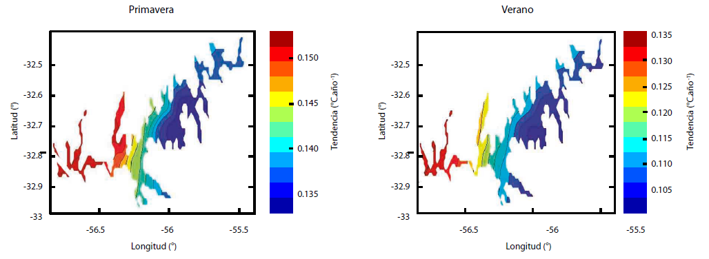 Trabajando con 16 años de datos satelitales (período 20022018) provenientes del producto MUR-GHRSST se encontró una respuesta global de los embalses Baygorria y Rincón de Bonete al aumento de su temperatura en 0,70 °C por año en la media anual, determinado por una pendiente de incremento de 0,13 °C por año en primavera-verano. Este aumento, presente principalmente por un calentamiento durante los meses de primavera-verano, podría deberse al calentamiento de la atmósfera reportado para la región (Bidegain, et al., 2014; IPCC, 2014). Considerando además que se analizaron 16 años de datos, no se descarta que al menos parte de esta tendencia observada podría responder a oscilaciones de baja frecuencia (ej. decadal), mayor al periodo estudiado (Chen y Tung, 2018).