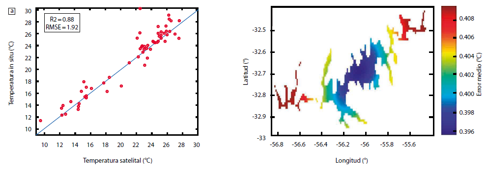 El ajuste de la regresión lineal entre ambas fuentes datos presentó una pendiente 0,97, intercepto igual a 0, varianza explicada del 88 % y un RMSE de 1,92 °C (Figura 7a). En cuanto al campo espacial del error medio del dato satelital, se observa un patrón concéntrico en el embalse, donde a mayor distancia de la costa, menor error. Los errores máximos se observan en los extremos, aguas arriba y aguas abajo. Sin embargo, las diferencias espaciales son menores a 0,01 °C en promedio (Figura 7b).