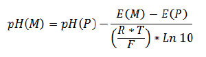 Donde la solución M tiene un valor desconocido de pH para la fuerza electromotriz E(M) y el Material de Referencia Certificado primario P tiene un valor de pH asignado. R es la constante de los gases, F la constante de Faraday y T la temperatura del baño.