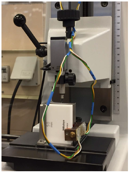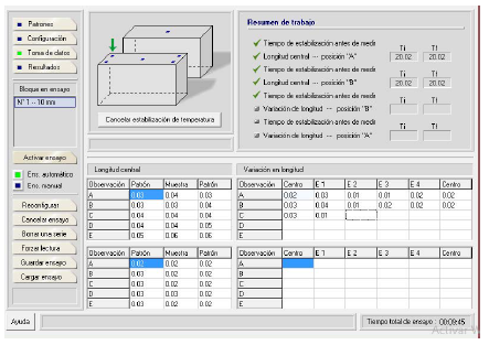a) La longitud central, determinada en ambas caras de medida por diferencia respecto a la de un patrón de referencia calibrado. Para esto se realizan cinco medidas de longitud de patrón de referencia (Cp) y longitud de muestra (Cx) para cada una de las posiciones de la muestra; es decir, se gira el bloque de muestra 180º luego de la primera serie de medidas para posicionar la cara 2 hacia arriba, y se repite la determinación.