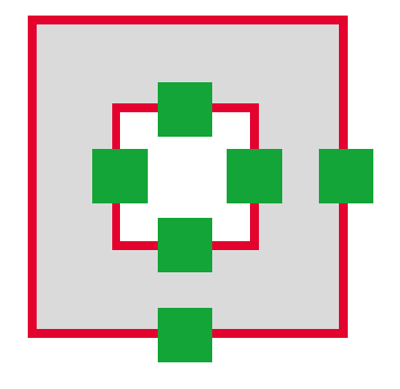 En este caso, los mayores inconvenientes se encontraron en la estrategia de medida automática ya que, si bien el detector de bordes limita los valores emitidos por el equipo a los puntos de contraste, es inevitable que en esta secuencia de trabajo se atraviesen puntos de contraste que no forman parte de las lecturas a tomar. Para solucionar este problema sin participación del operador se diseñó un algoritmo que pronostica el resto de las lecturas a partir de los tres primeros puntos tomados en la zona elegida. Luego se establece en estas coordenadas un margen de sensibilidad igual al semiespesor del alambre para todos los puntos donde se toma el perfil de contraste como coincidencia positiva. Otros puntos de contraste atravesados por el detector son ignorados. La Figura 2 representa gráficamente una abertura donde las áreas de coincidencia positivas estarían indicadas con los seis cuadrados pequeños. En otras zonas de contraste no se toman como lectura válida.