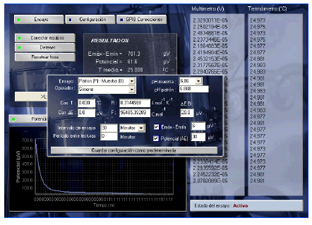 La diferencia de potencial E(M)-E(P) es medida a través de un multímetro y la temperatura a través de un sensor Pt100 con una frecuencia de una lectura por minuto. La diferencia de potencial y la temperatura son graficadas en función del tiempo para visualizar el punto final del ensayo. Éste se alcanza cuando la diferencia de potencial es menor a + 6 µV ó + 10 µV, dependiendo del valor de pH de las soluciones, en forma continua y durante un período de 30 minutos. Las condiciones de ensayo implican que la diferencia de potencial y la temperatura sean calculadas promediando estos últimos 30 valores leídos (Baucke,1994).