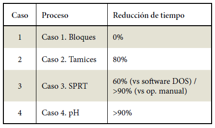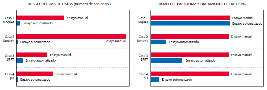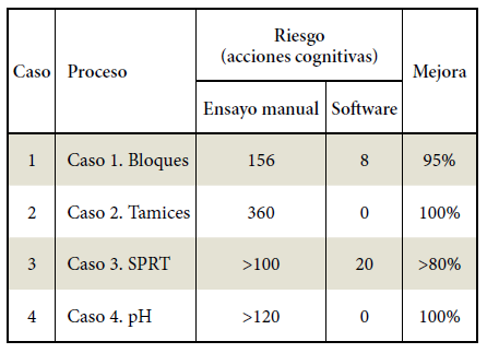 Riesgo. El trabajo técnico de rutina realizado en laboratorios no evalúa el número de acciones cognitivas inherentes a la toma de datos, sino solamente la calidad de ensayo, de modo que el concepto de riesgo asociado a la toma de datos no suele ser tenido en cuenta. En todos los casos estudiados el número de acciones cognitivas por ensayo manual es superior a 100. Este alto número de acciones de notación y transcripción por ensayo se ve multiplicado, además, por la demanda. Solo en el caso de termometría (Caso 3), se realizan anualmente más de 400 calibraciones en el LATU utilizando el software desarrollado. Teniendo en cuenta estos datos y a la luz de los estudios de Panko (2015), el número de errores esperado en ensayos manuales debe considerarse inadmisible, más allá de costos y tiempo invertido en acciones correctivas por trabajo no conforme. Como se ve en la Tabla 2, la reducción del riesgo fue, en todos los casos, mayor que el 80%, por lo que, de acuerdo a los porcentajes de error humano manejados por Panko (2015), el riesgo de error humano para estos procesos podría considerarse nulo si se utiliza un software de automatización.