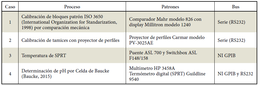 Este trabajo presenta cuatro casos. Cada uno trata los requisitos, las dificultades encontradas y el desarrollo general del software de automatización realizado. Los casos estudiados son: la calibración de bloques patrón ISO 3650 (International Organization for Standarization, 1998) con comparador mecánico, la calibración de tamices utilizando un proyector de perfiles, la medición de temperatura de SPRTs (Standard Platinum Resistance Thermometer) y la medición de pH por Celda de Baucke (Baucke, 1994) en secciones subsiguientes.