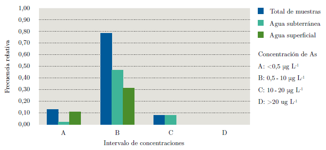 Al comparar los resultados entre las aguas superficiales y subterráneas se observa diferencia entre las concentraciones encontradas en ellas. Las muestras provenientes de aguas superficiales en su mayoría poseen concentraciones bajas, menores a 1,5 µg L-1, mientras que las subterráneas presentan casi en su totalidad valores de concentración de As mayores a 5 µg L-1. Los resultados se representan de forma gráfica en la Figura 1, donde se dividió el rango de concentraciones de As obtenidas según las normativas legales y se evalúa si el mayor aporte de As proviene de aguas superficiales o subterráneas. Se observa claramente que para concentraciones desde el nivel de cuantificación hasta 20 µg L-1 el aporte que prima siempre es de origen subterráneo. Esta observación se puede deber a procesos de origen geogénico, a la composición y condiciones de suelo subterráneo. En general, el pH del suelo es levemente alcalino y junto con las condiciones reductoras se favorece la desorción del As desde fases adsorbidas del suelo, vertiéndose en el agua presente (Smedley y Kinniburgh, 2002).