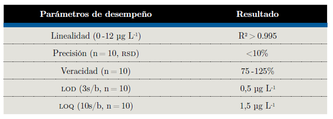 La metodología para la determinación de As se adaptó basándose en las recomendaciones de la APHA con el objetivo de trabajar dentro de los lineamientos de la química verde, con el uso de la menor cantidad de reactivos, con la menor concentración posible y generando la menor cantidad de residuos, en el menor tiempo de análisis. Se realizó una digestión en condiciones fuertemente ácidas para eliminar materia orgánica presente. Luego de la digestión las muestras se redujeron con el agregado de ioduro de potasio para obtener la forma adecuada de As para la generación de hidruros. Se estudiaron parámetros de desempeño para evaluar las modificaciones realizadas y los resultados obtenidos se incluyen en la Tabla 1.