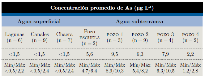 La concentración de As encontrada tanto para aguas superficiales y subterráneas en el predio de la empresa arrocera, en el pueblo vecino y las zonas aledañas es en general similar, por lo que se podría atribuir la presencia de As en la zona a su proveniencia natural desde los suelos de la zona.