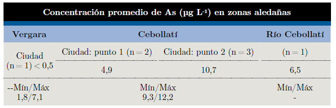 La norma nacional UNIT 833 (Instituto Uruguayo de Normas Técnicas, 2008) determina el valor máximo permitido de As en 20 µg L-1para agua potable. Como se observa en los resultados tanto de las aguas superficiales como de las subterráneas, las concentraciones promedio de As obtenidas cumplen con la especificación. Esto es de significativa relevancia, ya que las aguas subterráneas de pozo son las que abastecen a la población de la zona y no se observa anomalía en la concentración de As que consumen.
