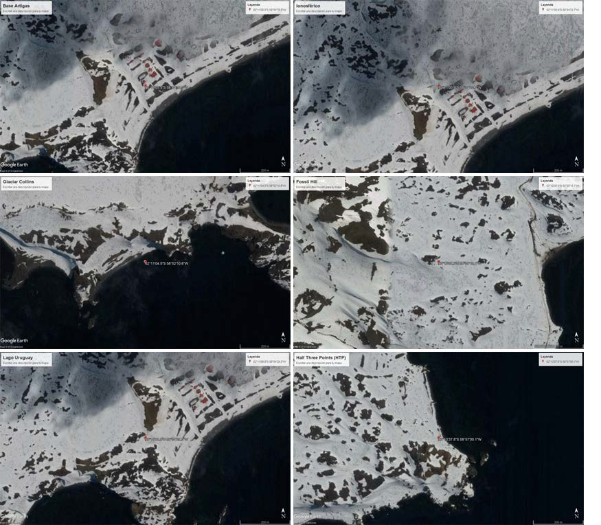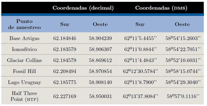 Se dispuso de seis muestras de aguas y seis muestras de suelos obtenidos en seis puntos de muestreo próximos a la base uruguaya en Antártida. Las muestras fueron aportadas por la Dra. Silvana Vero del área de Microbiología de la Facultad de Química, quien al momento de los trabajos era responsable de un proyecto de investigación autorizado por el Instituto Antártico Uruguayo. Las muestras de agua fueron colectadas en recipientes de vidrio borosilicato 3.3 con tapa a rosca, transportadas a 1-5 °C hasta su arribo a los laboratorios de Facultad de Química, acidificadas a pH<2 con HNO3 pa (Asociación Española de Normalización y Certificación, 2003) y posteriormente colocadas en freezer a -20 °C hasta el traslado a Brasil, donde nuevamente fueron colocadas en freezer hasta el análisis. Las muestras de suelos fueron colectadas directamente en recipientes de plástico con tapa a rosca y con las mismas condiciones de frío que las muestras de agua hasta que fueron analizadas; en este último caso no se agregaron aditivos. Las coordenadas que ubican los puntos de muestreo se especifican en la Tabla 1.