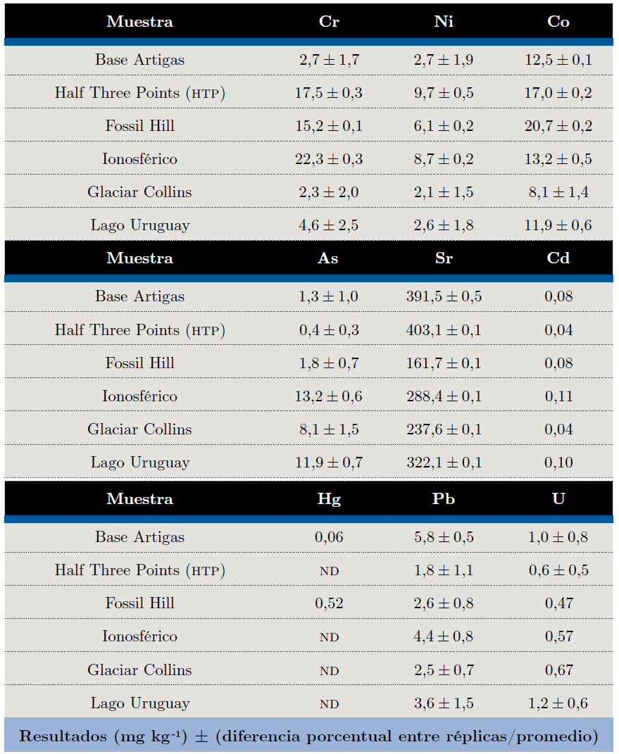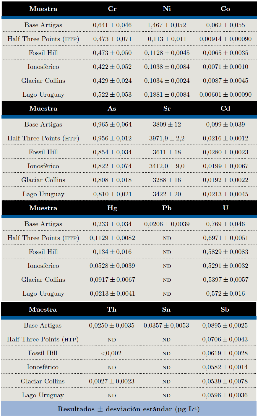 Resumen: La investigación científica en la Antártida se ha incrementado en los últimos años, fundamentalmente en áreas como microbiología, biología y oceanografía. Existen pocos reportes sobre los niveles de contaminantes inorgánicos y el impacto antrópico relacionado a ellos en el ecosistema. Al ser un territorio prácticamente virgen, es de particular interés realizar esta evaluación. En este trabajo se analizaron por primera vez y como primera aproximación al abordaje del tema seis muestras de aguas y seis muestras de suelos obtenidas en seis puntos de muestreo próximos a la base uruguaya en Antártida. Los elementos determinados para ambas matrices fueron: cromo, níquel, cobalto, arsénico, estroncio, cadmio, mercurio, plomo, uranio. En agua también se determinaron torio, estaño y antimonio. La preparación de las muestras de suelos se realizó mediante un tratamiento asistido con radiación de microondas; las muestras de agua fueron analizadas directamente. Las determinaciones analíticas se realizaron mediante espectrometría de emisión atómica de plasma de acoplamiento inductivo acoplado a masas y óptico (ICP-MS e ICP-OES). La mayoría de los elementos se encuentran dentro de los límites establecidos por algunas agencias de regulaciones ambientales, como Canadian Environmental Quality Guidelines-CCME o United States Environmental Protection Agency–USEPA, y es llamativo fundamentalmente el contenido de estroncio en aguas.