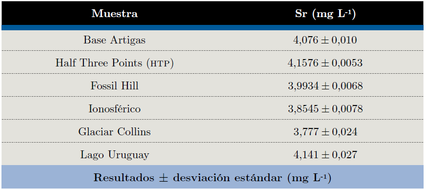 Los contenidos de mercurio en las seis muestras analizadas cumplen con los límites establecidos por US EPA pero superan los límites establecidos por CCME. Respecto al contenido de cadmio, una de las muestras presenta un contenido del metal que se encuentra cerca del límite del valor máximo sugerido por CCME pero cumple con lo establecido por US EPA en todas las muestras analizadas. Particularmente es de destacar el contenido de estroncio en las muestras de agua. La US EPA ha establecido un límite de 4,0 mg L-1 para este metal en agua de consumo directo (2018 Drinking Water Standards and Health Advisories Tables). Los contenidos de estroncio determinados por ICP-OES en las seis muestras están en el entorno del valor máximo sugerido por esa agencia, tres de ellas poco por debajo y tres de ellas por encima de ese valor (resultados en el rango 3,78 – 4,16 mg L-1). El valor promedio obtenido en los puntos muestreados fue precisamente el del valor máximo sugerido por US EPA. Estos resultados son del mismo orden que los determinados por ICP-MS (resultados en el rango 3,29 – 3,97 mg L-1). Si bien son pocas muestras, es un estudio de screening para obtener los primeros datos sobre niveles de estroncio, pues no se conocen antecedentes sobre estudios de este tipo.