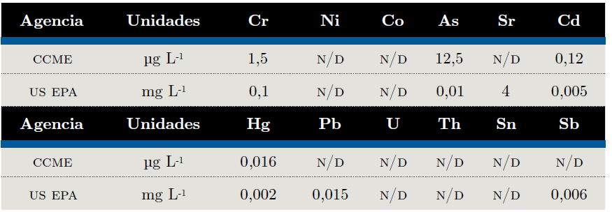 Algunas agencias de regulaciones ambientales, como Canadian Environmental Quality Guidelines - CCME o United States Environmental Protection Agency – US EPA (United States Environmental Protection Agency - USEPA, [s.d.]), establecen límites máximos para contaminantes inorgánicos en aguas. CCME publica una guía que refiere a aguas de consumo y aguas marinas (Canadian Council of Ministers of the Environment - CCME, 2007a, 2007b). US EPA también publica guías de referencia y recomendaciones para aguas de consumo (Safe Drinking Water Act y 2018 Drinking Water Standards and Health Advisories Tables) que establecen el contenido máximo admisible de contaminantes inorgánicos en agua de consumo humano. Si bien las aguas estudiadas no son de consumo directo, igualmente se toman en cuenta las recomendaciones de las agencias antes citadas para ese tipo de aguas. Un resumen de los contenidos máximos sugeridos se presenta en la Tabla 11.