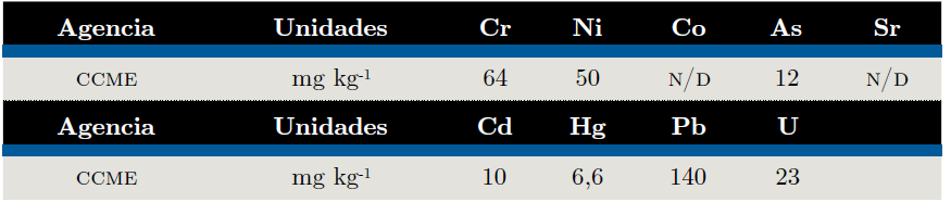 Para esta discusión se toman en cuenta los valores máximos recomendados por CCME para suelos de parques. En la Tabla 12 se resumen estos valores.