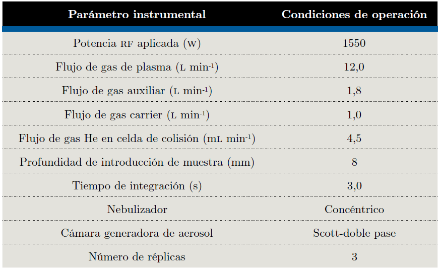 La determinación de los elementos se realizó mediante espectrometría de emisión atómica de plasma acoplado a masas, habiéndose utilizado un ICP-MS Agilent 7800 (Agilent Technologies, Tokio, JHS, Japón) equipado con nebulizador concéntrico, cámara generadora de aerosol de cuarzo, bomba peristáltica de bajas pulsaciones de 10 cilindros, introducción de muestra mediante sistema HMI (High Matrix Introduction), antorcha de cuarzo con control en tres dimensiones (horizontal, vertical y profundidad), celda de colisión de tipo octapolo (ORS, Octapole Reaction System) y analizador de masas de tipo cuadrupolo. Las mediciones se utilizaron en el modo de colisión He (White Martins-Praxair, Sertãozinho, SP, Brasil) y modo sin gas. Las condiciones de operación se detallan en la Tabla 2.