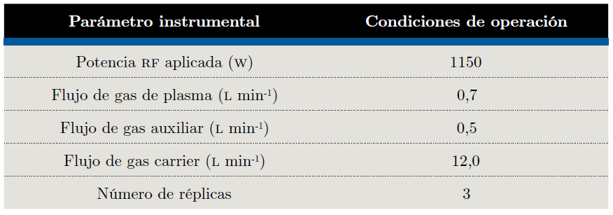 La determinación de estroncio se realizó además utilizando un espectrómetro de emisión óptica de plasma acoplado inductivamente (ICP-OES) iCAP6000 (Thermo Fisher Scientific, Waltham, MA, EE.UU.) que funciona en modo de vista radial y axial y está equipado con un detector de CID simultáneo y rejilla Echelle, una bomba peristáltica, nebulizador concéntrico, cámara de pulverización ciclónica y antorcha de plasma desmontable de cuarzo con un inyector de tubo central con un diámetro interno de 2,0 mm. Se seleccionó la línea de emisión de 421,5 nm, que posee una intensidad de emisión adecuada para la determinación. Las condiciones de operación se muestran en la Tabla 3.