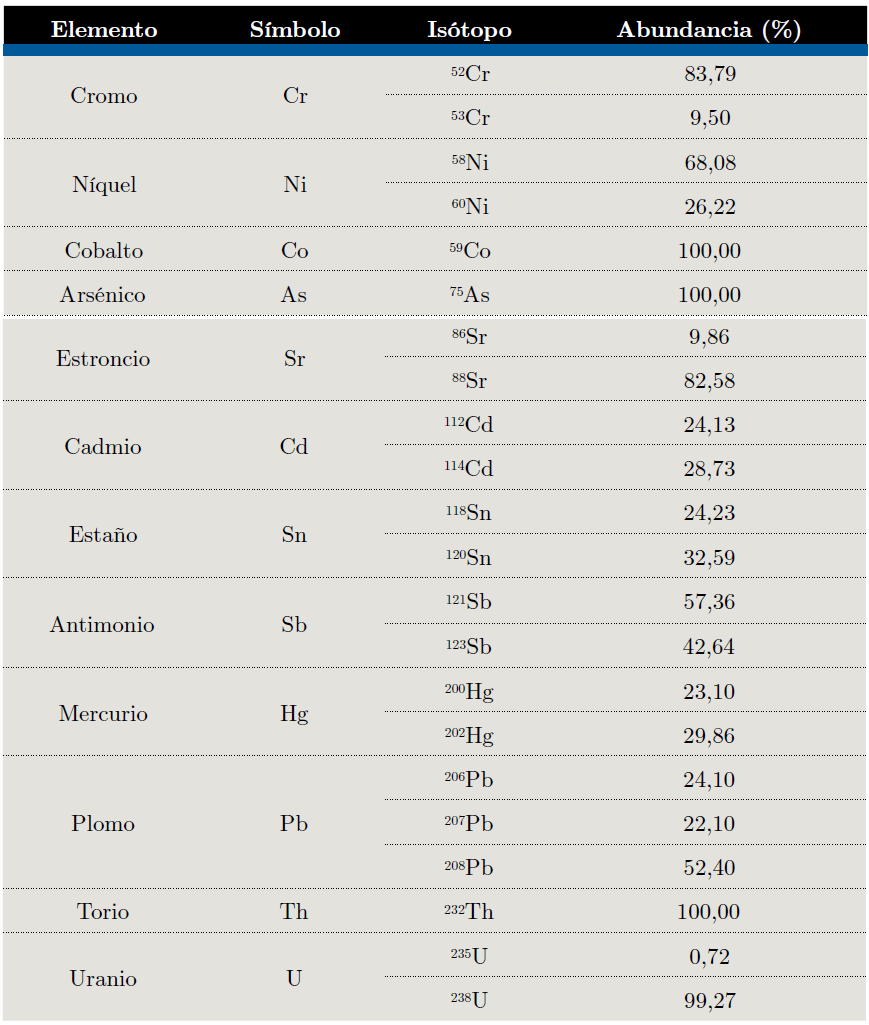 Los elementos determinados para ambas matrices fueron: cromo, níquel, cobalto, arsénico, estroncio, cadmio, mercurio, plomo, uranio; en agua además se determinaron los elementos torio, estaño y antimonio. Se analizaron los isótopos más abundantes de cada elemento (Perkin Elmer SCIEX, 2008).