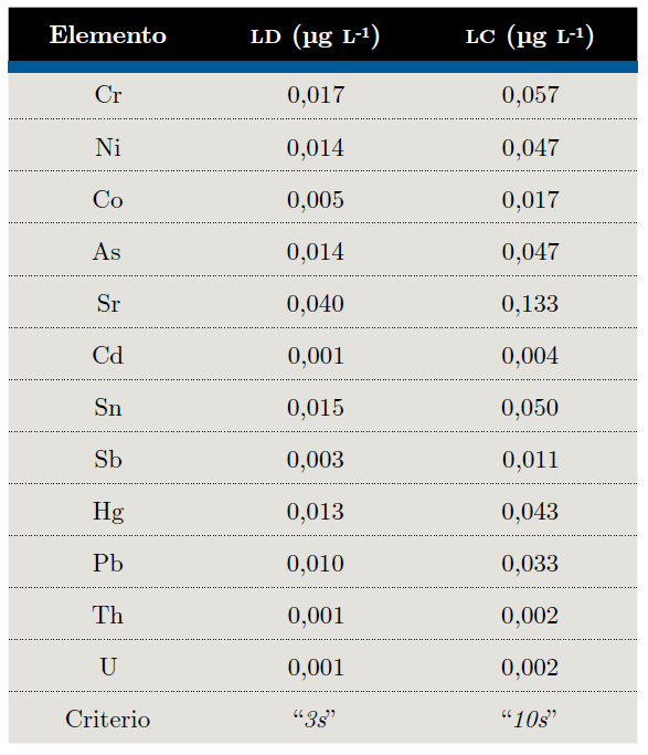 Para las determinaciones mediante ICP-MS se estudiaron los siguientes parámetros de desempeño: linealidad, límite de detección, límite de cuantificación y veracidad. Para realizar la evaluación de veracidad de todos los elementos determinados excepto estroncio se fortificaron muestras a dos niveles de concentración (adición de 1 µg L-1 y 2 µg L-1 de patrones de cada analito). Para el estudio de veracidad en la determinación de estroncio, las muestras diluidas 100 veces se adicionaron con 10 y 25 µg L-1 de un patrón de Sr.