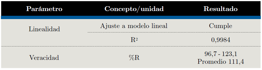 En las Tablas 5, 6 y 7 se presentan los resultados obtenidos de los parámetros de desempeño evaluados y en las Tablas 8, 9 y 10 los resultados obtenidos en las muestras analizadas.