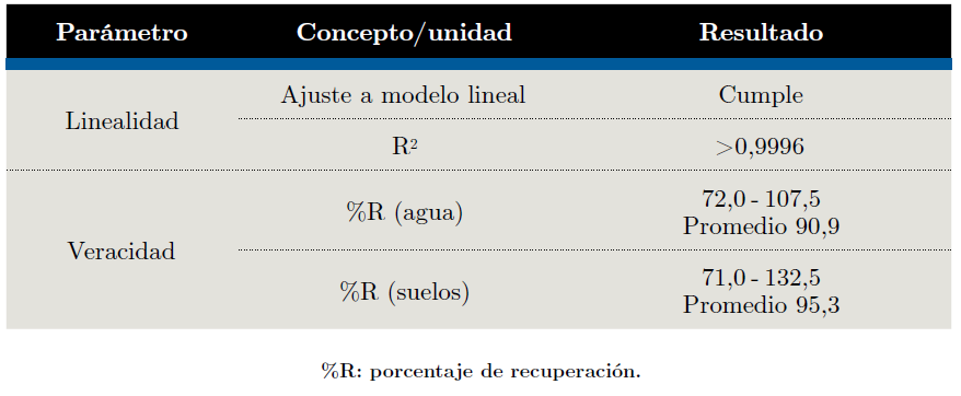 La validación de la metodología para las dos técnicas instrumentales utilizadas arrojó resultados satisfactorios para el fin propuesto, adecuados para estudios ambientales.