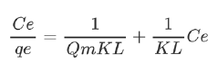 qe representa la cantidad adsorbida por gramo de adsorbente en el equilibrio (mg g-1); Ce es la concentración del adsorbato en el equilibrio (mg L-1); Qm representa la cobertura máxima de la monocapa (mg g-1), y KL es la constante de Langmuir (L mg-1), que está relacionada con la energía de adsorción que refleja la afinidad entre adsorbente y adsorbato (Marco-Brown, et al., 2014).