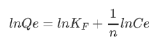KF es la constante de Freundlich (mg g-1) que indica la capacidad de adsorción; Ce es la concentración del adsorbato en el equilibrio (mg L-1); Qe es la cantidad adsorbida por gramo de adsorbente en el equilibrio (mg g-1), y n indica cualitativamente la reactividad de los sitios de conexión (Sodré, 2001).