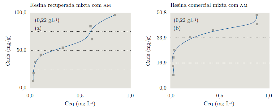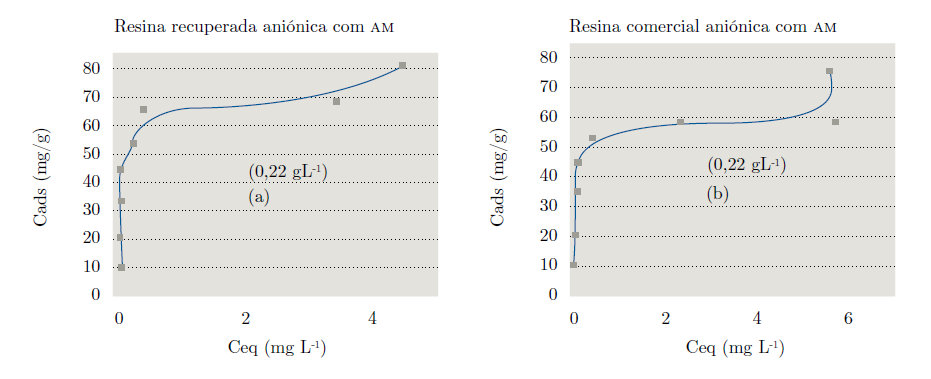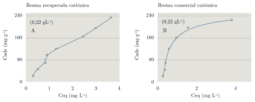 Con el fin de obtener más datos y caracterizar el proceso adsortivo de las resinas comerciales y recuperadas, se aplicó a los datos obtenidos los modelos matemáticos de Langmuir y Freundlich. Además, se realizó una estimación de la capacidad máxima de retención de especies por las resinas (Sposito, 1989).
