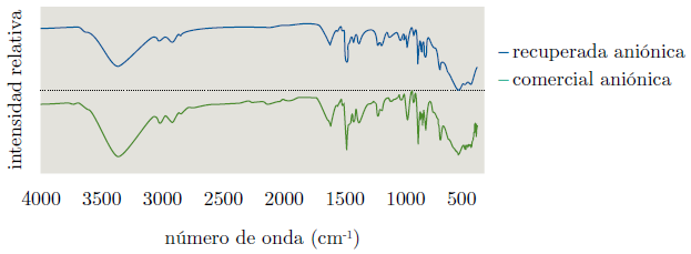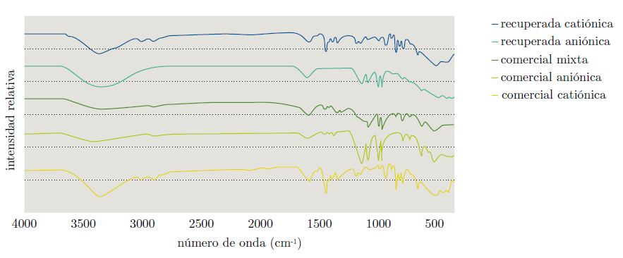 Por último, en relación a las pruebas de infrarrojos, se presentan en la Figura 4 las curvas referentes a las resinas comerciales y recuperadas, aniónicas y catiónicas.