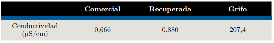 Los datos presentados son la media de 10 mediciones y el valor para el agua tratada con la resina recuperada está cerca del rango ideal para el agua desionizada (0,5 a 3,0 μS cm-1; Gekaka, 2013), como se puede ver en la Tabla 1.