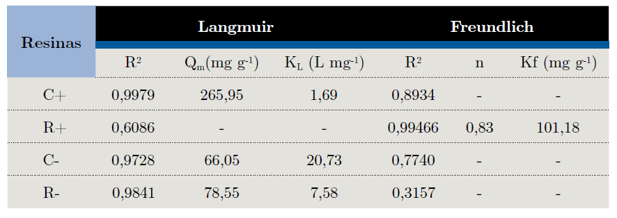 La R+ posee una mayor correlación con el perfil de adsorción heterogéneo, a diferencia de las otras tres resinas estudiadas (C+, C-, R-, Langmuir). Para realizar una comparación global, se utilizan como dato común los factores encontrados en las ecuaciones 1 y 2, Qm y Kf, respectivamente. Ambos expresan un mismo sentido físico, la cantidad máxima adsorbida.