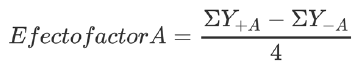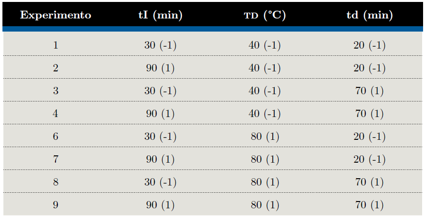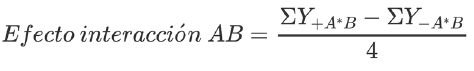 donde y es la variable de respuesta obtenida, e Y+A y Y+A indican aquellas respuestas y obtenidas cuando el factor A recibió una codificación positiva o negativa, respectivamente. El denominador indica los pares de respuestas Y+A ,Y-A presentes en este diseño de ocho experimentos. Para el estudio de la interacción entre los factores A y B se toman las respuestas Y+A*B ,Y-A*B obtenidas cuando el factor de la codificación de A y B fue positivo o negativo, respectivamente. Numéricamente, cuanto mayores sean estos resultados, mayor es el efecto del factor o interacción de los factores en el proceso estudiado. A su vez, cuando un efecto es positivo, la respuesta aumenta a medida que aumenta el factor y viceversa. La elección de las condiciones óptimas se realizó con un sistema de puntuación diseñado especialmente mediante el cual se asignó un punto por cada condición de optimización cumplida en el experimento, estudiada para cada variable de respuesta. Luego estos puntos se sumaron. Las condiciones de optimización por variable de respuesta fueron seleccionadas como aquellos factores o combinación de factores que presentaron un efecto significativo sobre cada variable de respuesta.