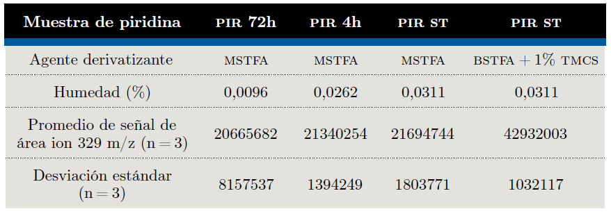 Las muestras se secaron según lo descrito en la sección anterior y se les agregó 200 μL de piridina (PIR 72h, PIR 4h o PIR ST, según el caso) y 50 μL de MSTFA o BSTFA + 1% TMCS, según corresponda (ver sección “Optimización de solvente y agente de derivatización” en Resultados y discusión). De forma paralela, se determinó la humedad de las muestras de piridina que recibieron diferentes tratamientos de secado por titulación culombimétrica Karl-Fisher por quintuplicado.