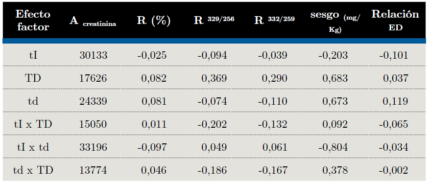 El efecto de los factores tI, td y TD sobre las variables de respuesta área de creatinina, sesgo, eficiencia de derivatización y relación de ED se calcularon según las Ecuaciones 2 y 3 y se detallan en la Tabla 4.