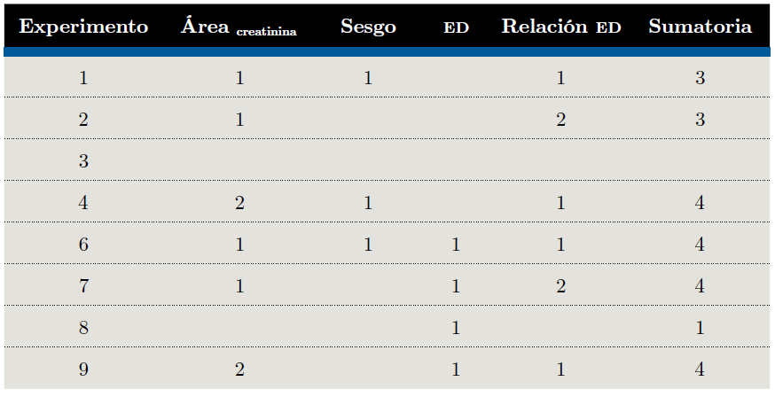 A partir de la tabla se observa que los experimentos que sumaron mayor puntaje en cuanto a criterios cumplidos son E4, E6, E7 y E9. No obstante, E7 y E9 no cuentan con las condiciones necesarias para la disminución del sesgo, un parámetro de mayor importancia porque afecta directamente la veracidad del método. Por esta razón se descartaron. El experimento E6 presentó como ventaja sobre E4 que la eficiencia de derivatización fue mayor y, adicionalmente, que el tiempo de análisis fue menor (E6: tI + td = 50 min vs 160 min para E4). Por lo tanto, se consideró que E6 presentó las mejores condiciones para este análisis en cuanto a veracidad y tiempo de análisis.